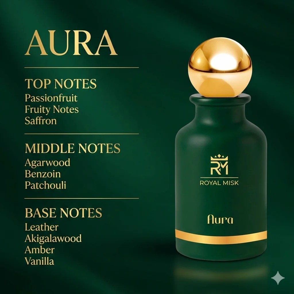 Aura captivates with an exotic blend of fruity passionfruit and precious saffron, unveiling a heart of rich agarwood, warm benzoin, and earthy patchouli. The base settles into a sensual embrace of supple leather, akigalawood, golden amber, and creamy vanilla. A fragrance that radiates sophistication and timeless allure.